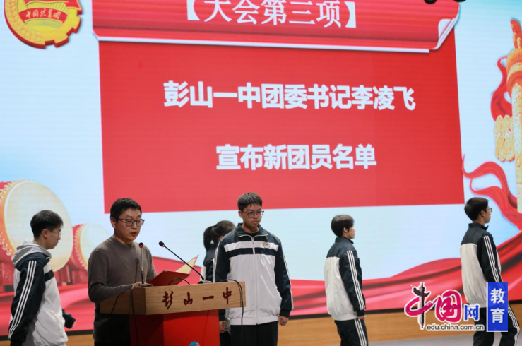 领导致辞后,庄严的入团仪式正式开始。彭山一中党委委员、校团委书记李凌飞郑重宣读新团员名单后,新晋团员有序登台,列队整齐。校党委委员、副校长殷智慧为团员代表颁发团员证,校党委副书记周豪为团员代表佩戴团徽。在李凌飞老师的领誓下,全体新团员面向鲜红的团旗,以铿锵有力的声音庄严宣誓:“我志愿加入中国共产主义青年团!”